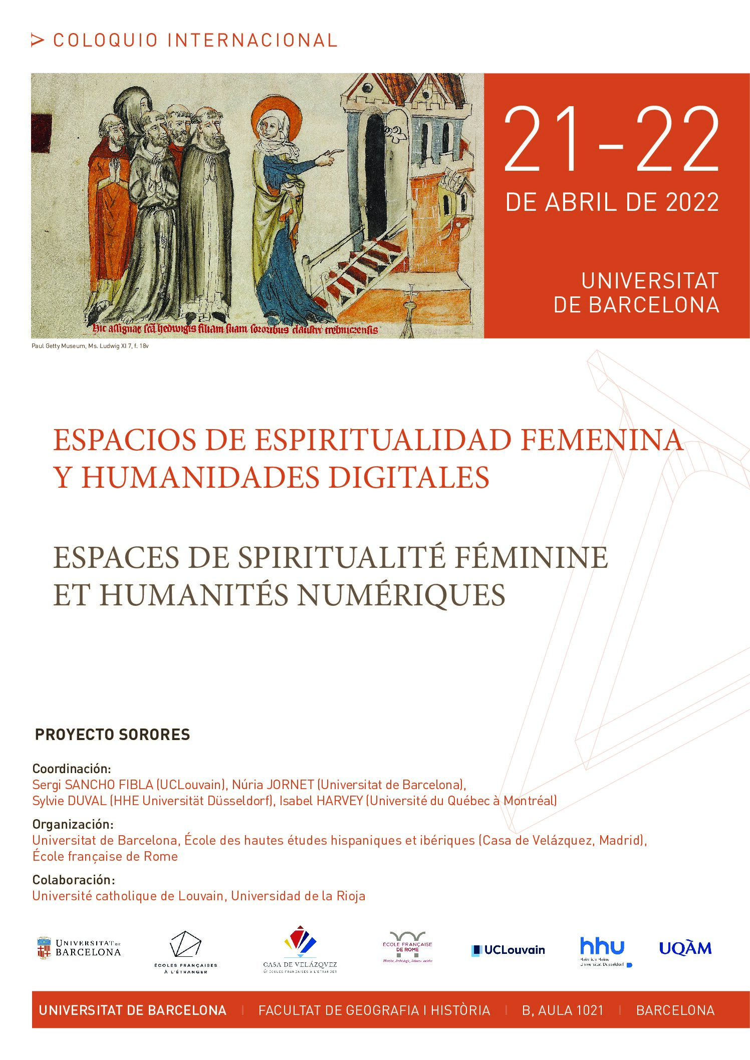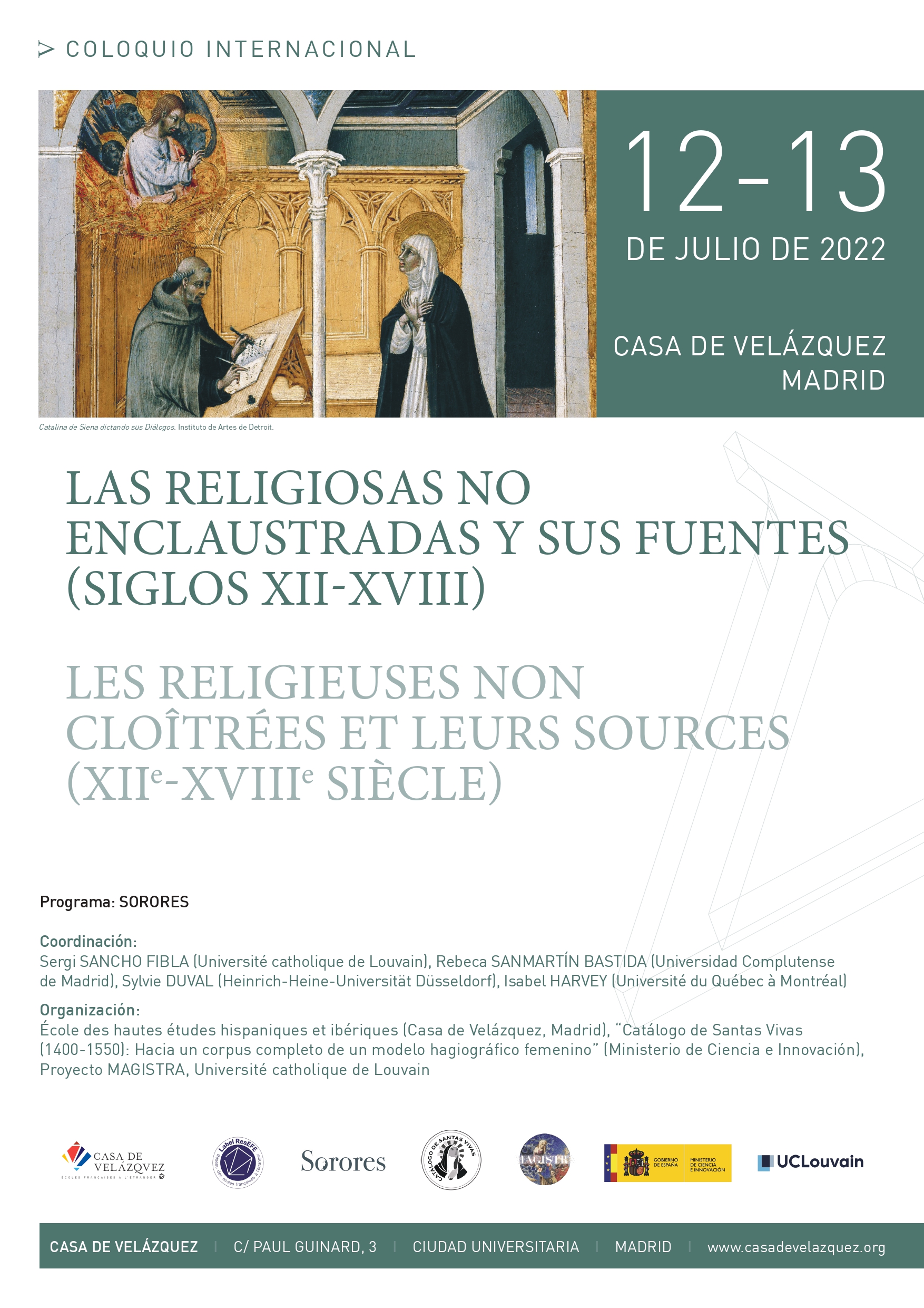 Los programas Sorores “Les religieuses non cloîtrées en Europe du Sud, xiie–xviiie siècle” (RESEFE: Casa de Velázquez / EFR) y “Catálogo de santas vivas (1400-1550): hacia un corpus completo de un modelo hagiográfico femenino” (Ministerio de Ciencia e Innovación) tienen el placer de presentar este coloquio internacional, organizado gracias al apoyo del proyecto Magistra (Université catholique de Louvain). Este encuentro tiene como objetivo reflexionar sobre los diferentes tipos de fuentes y colecciones archivísticas que permiten, desde ángulos muy diversos, el estudio de las religiosas no enclaustradas.